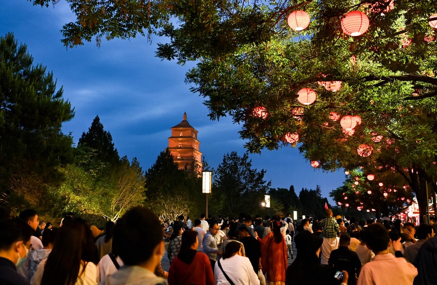 People visit the Dayan Pagoda scenic spot in Xi'an, capital of northwest China's Shaanxi Province, May 1, 2023. (Photo by Zou Jingyi/Xinhua)