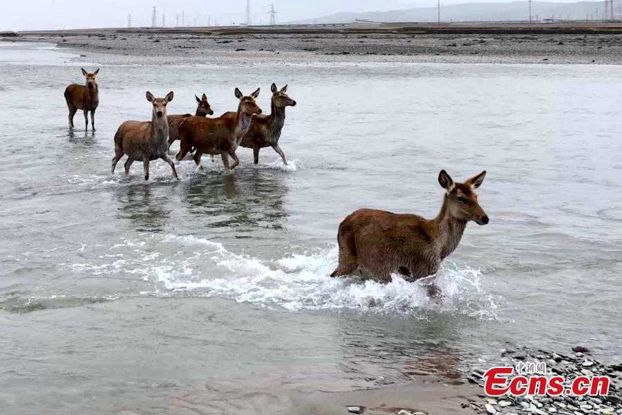 A herd of red deer cross the Buha River in Gangcha County of Haibei Tibetan Autonomous Prefecture, northwest China's Qinghai Province. (Photo/China News Service)