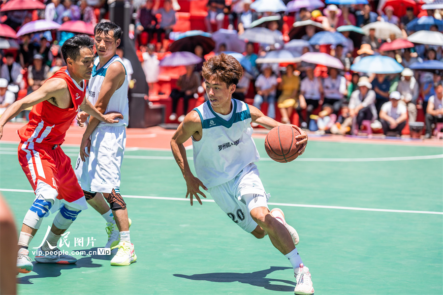Players compete in a basketball game in Yemachuan township, Hezhang county, Bijie city, southwest China's Guizhou Province, May 3, 2023. (vip.people.com.cn/Luo Dafu)