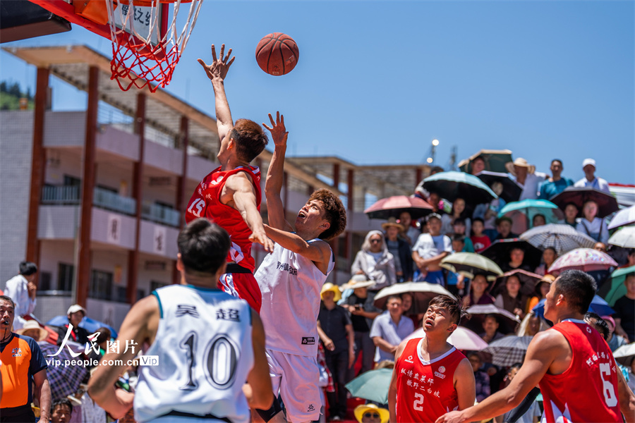 Players compete in a basketball game in Yemachuan township, Hezhang county, Bijie city, southwest China's Guizhou Province, May 3, 2023. (vip.people.com.cn/Luo Dafu)