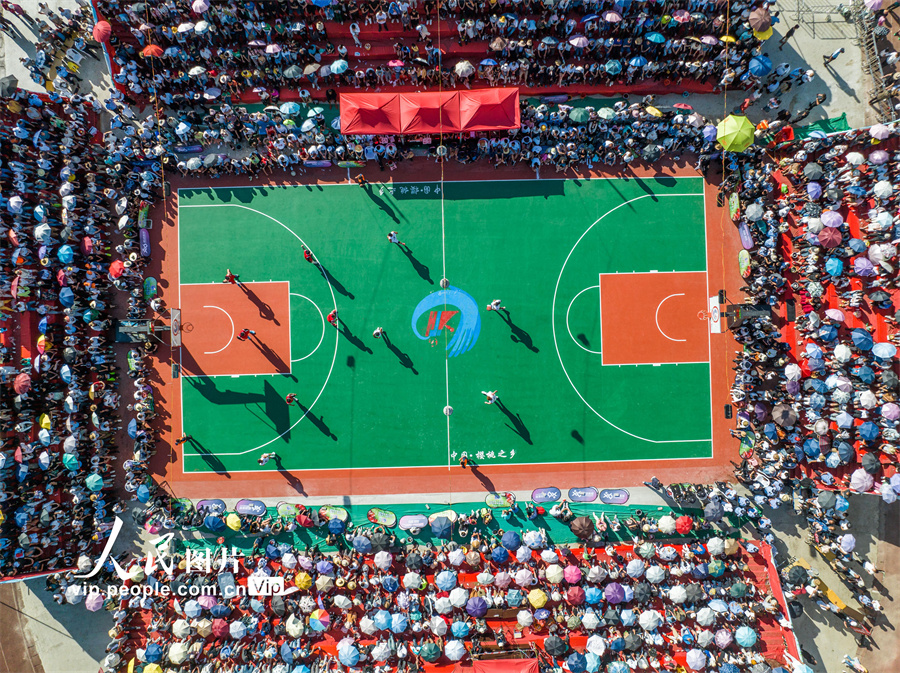 People watch a basketball game in Yemachuan township, Hezhang county, Bijie city, southwest China's Guizhou Province, May 3, 2023. (vip.people.com.cn/Luo Dafu)