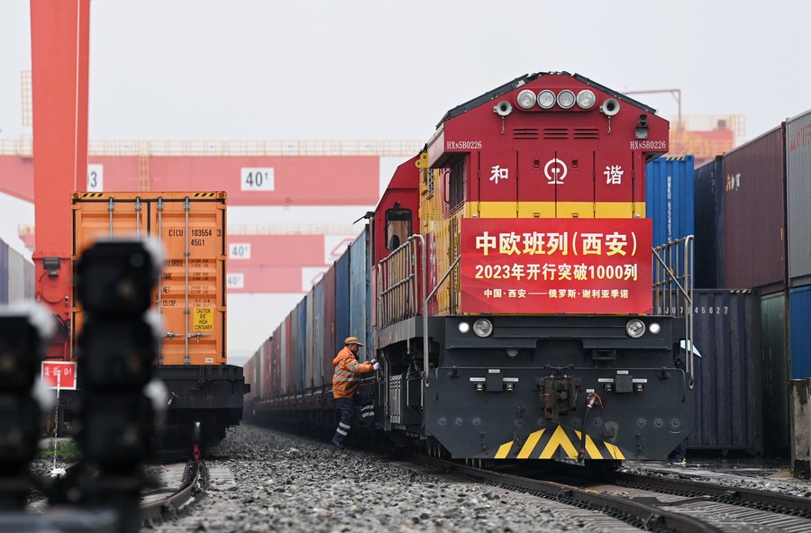 A China-Europe freight train is pictured at Xi'an International Port in Xi'an, northwest China's Shaanxi Province, March 23, 2023. (Xinhua/Li Yibo)
