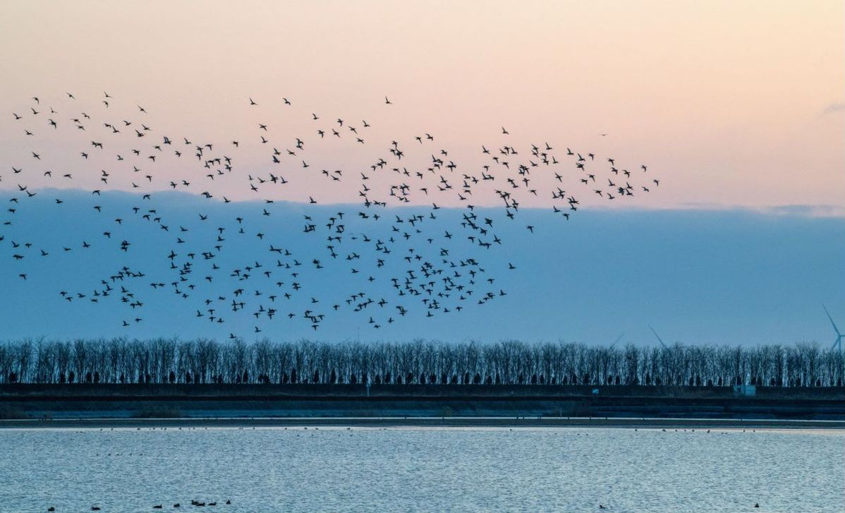 Flocks of birds fly over the Tiaozini wetland, in Feb 2023. [Photo by Sun Jialu/for chinadaily.com.cn]