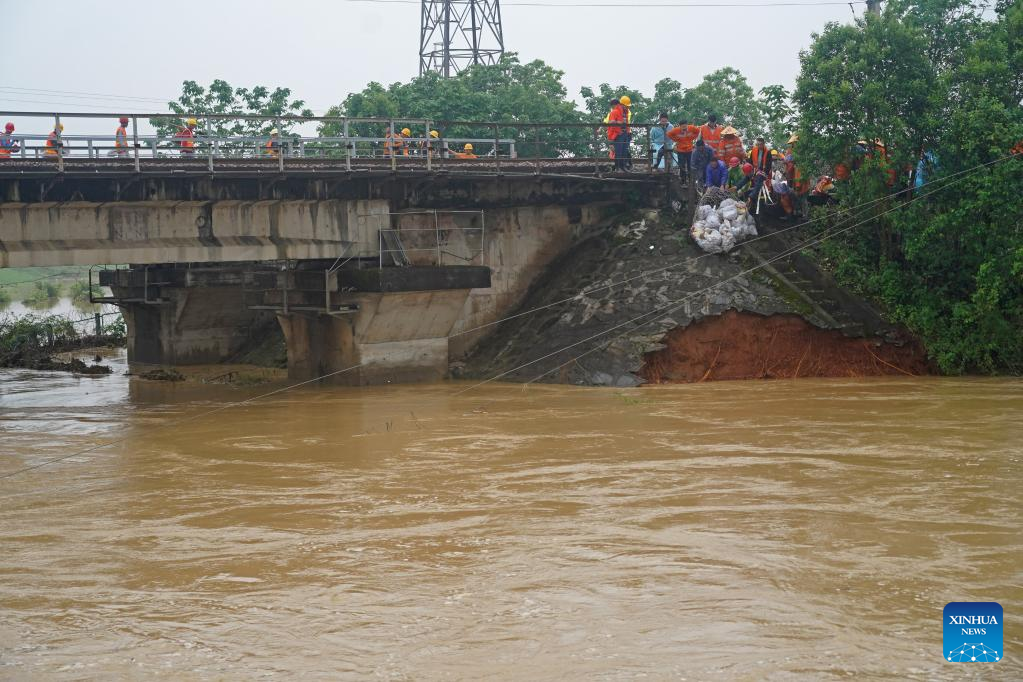 Rescuers work at the construction site of the breached Qingfeng dike in Yichun City, east China's Jiangxi Province, May 6, 2023. (Xinhua/Wan Xiang)
