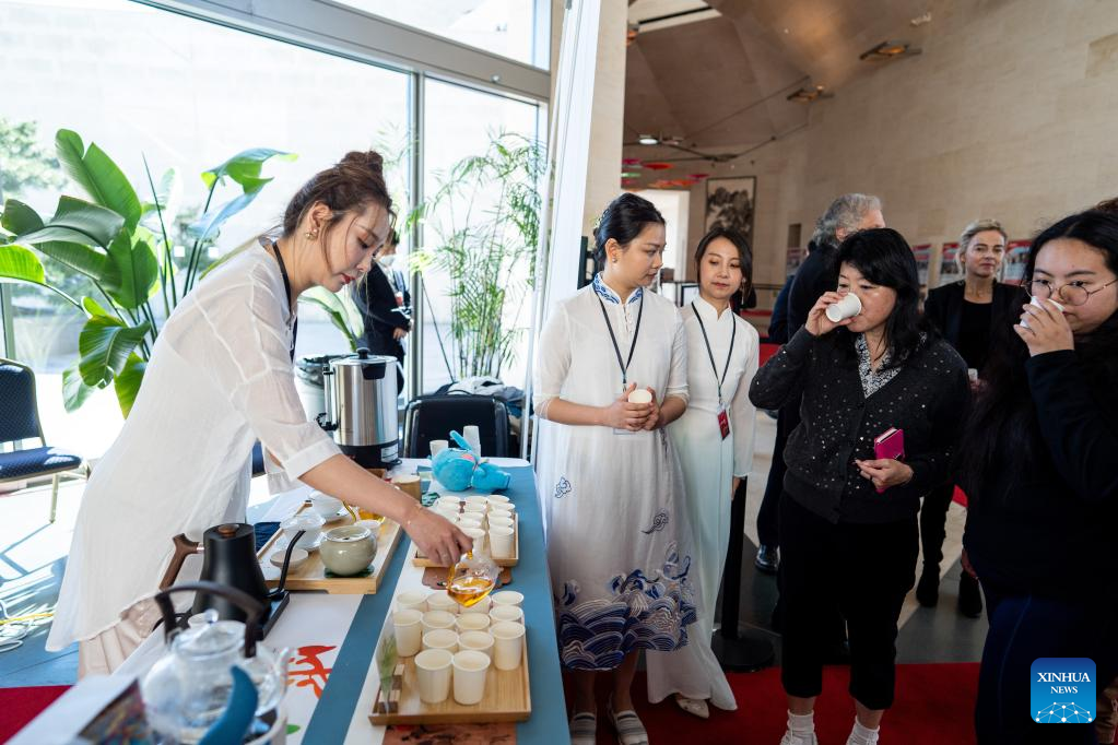 Visitors taste Chinse tea at the Chinese Embassy in the United States in Washington, D.C., the United States, on May 6, 2023. The Chinese Embassy in the United States joined the Around the World Embassy Tour of Washington D.C. and held an open house event themed "Yunan: A Many-Splendored Life" presenting the southwestern Chinese province on Saturday. (Xinhua/Liu Jie)