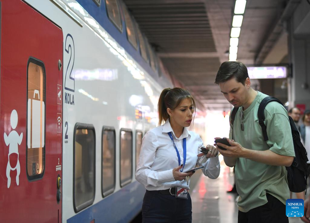 Passengers are to board a train to Novi Sad at the Belgrade station in Serbia, May 6, 2023. The 80-kilometer-long, Chinese-built Belgrade-Novi Sad high-speed railway has been carrying passengers at speeds of up to 200 kilometers per hour since March 2022. (Xinhua/Ren Pengfei)