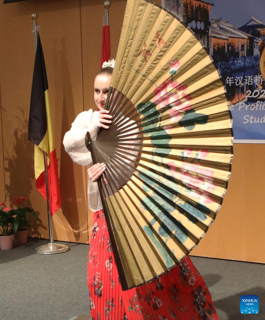 Kiana Vanderbieren, winner of the first prize in the secondary level competition, shows her skills at the Katholieke Universiteit Leuven, in Leuven, Belgium, May 6, 2023. (Xinhua/Pan Geping)