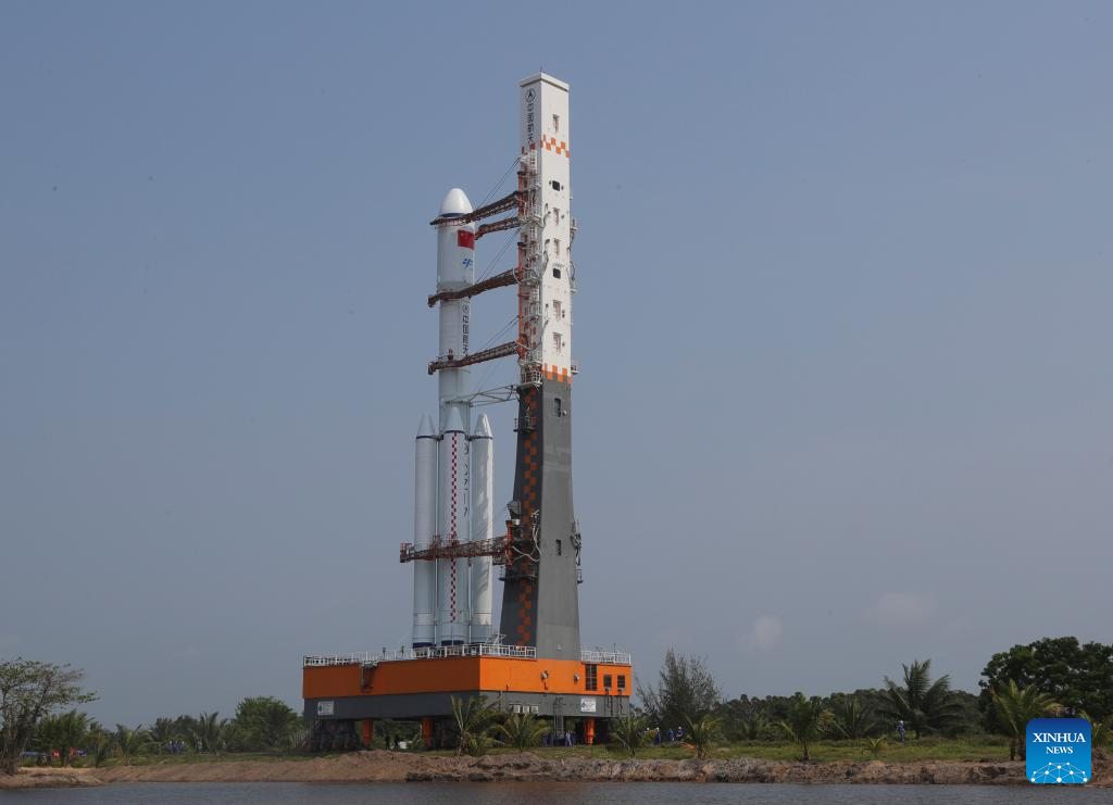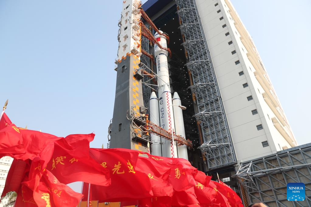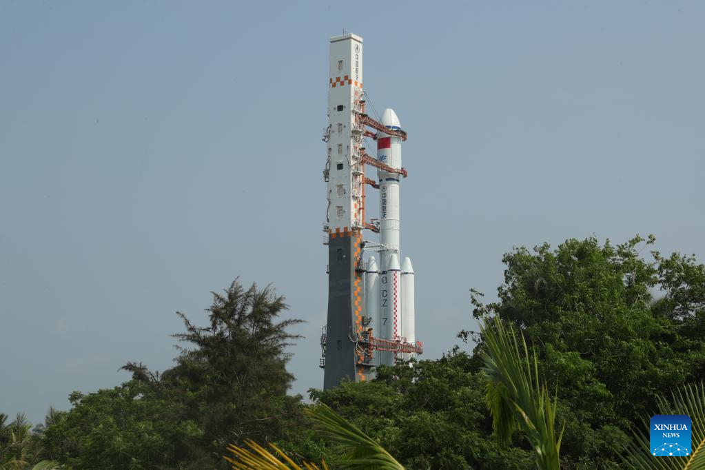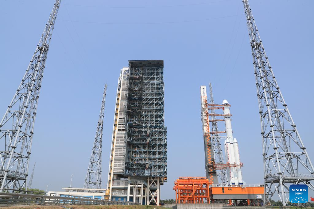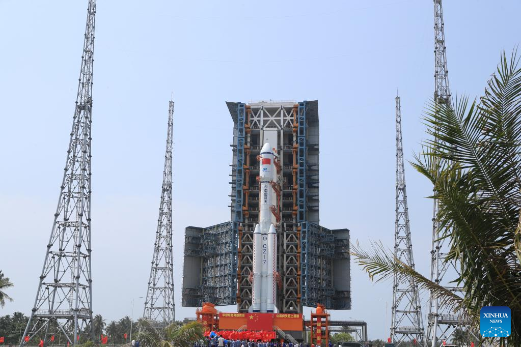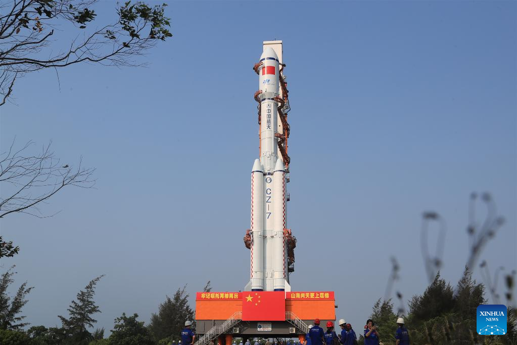 This photo taken on May 7, 2023 shows the combination of the Tianzhou-6 cargo spacecraft and a Long March-7 Y7 carrier rocket transferred to the launching area in south China's Hainan Province. The combination of the Tianzhou-6 cargo spacecraft and a Long March-7 Y7 carrier rocket has been transferred to the launching area. The cargo spacecraft will be launched in the near future at an appropriate time. (Photo by Huang Guochang/Xinhua)