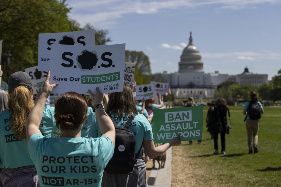 People march to the Capitol to protest for a ban on assault weapons, in Washington, D.C., the United States, on April 17, 2023. (Photo by Aaron Schwartz/Xinhua)