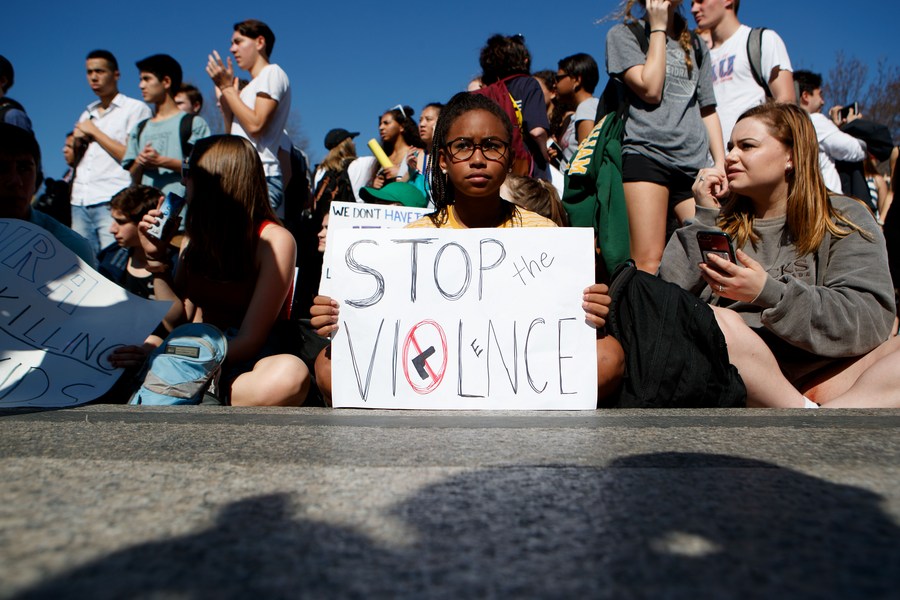 Students from Washington local high schools demonstrate for stricter gun control outside the White House in Washington D.C., the United States, on Feb. 21, 2018. (Xinhua/Ting Shen)