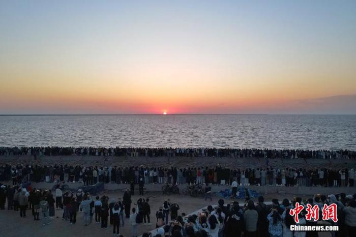 Tourists watch the sun rise in a seaside amusement park in the Binhai New Area of north China's Tianjin on the morning of May 3, 2023. (Photo/Tong Yu)