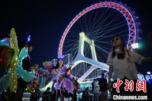 Photo shows tourists at the Tientsin Eye Ferris Wheel, also known as the Tianjin Eye, one of the city's landmarks, which was renovated for the Labor Day holiday. (Photo/Tong Yu)