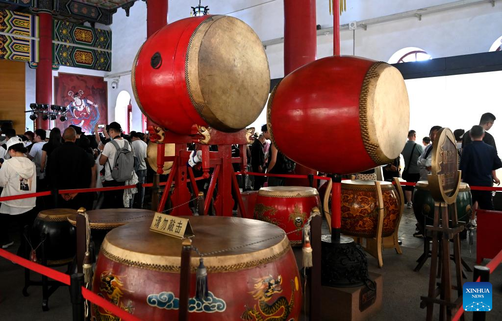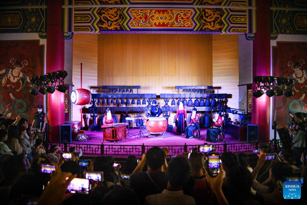 Tourists watch a performance at the Drum Tower in Xi'an, northwest China's Shaanxi Province, May 1, 2023. (Photo by Zou Jingyi/Xinhua)