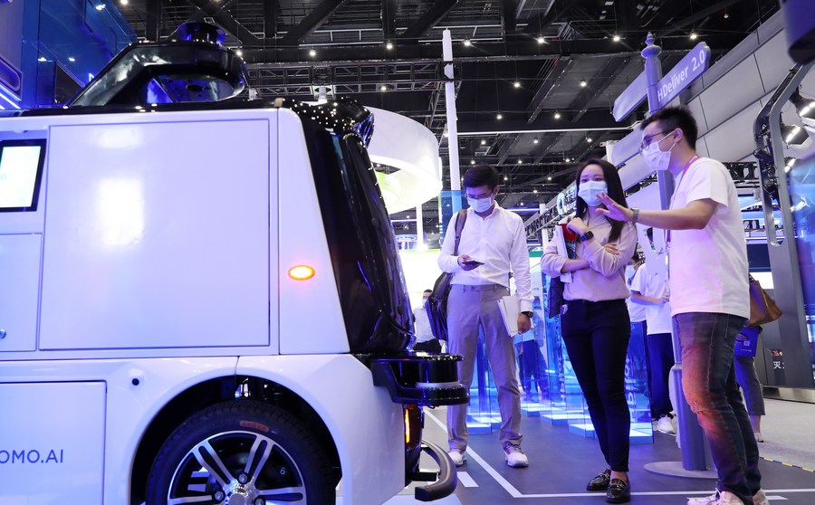 A staff member (R) introduces an intelligent logistics vehicle at the 2022 World Artificial Intelligence Conference (WAIC) in east China's Shanghai, Sept. 1, 2022. (Xinhua/Fang Zhe)