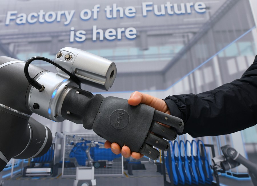 A visitor shakes hands with an intelligent robot at Hannover Messe 2023 in Hannover, Germany, April 19, 2023. (Xinhua/Ren Pengfei)