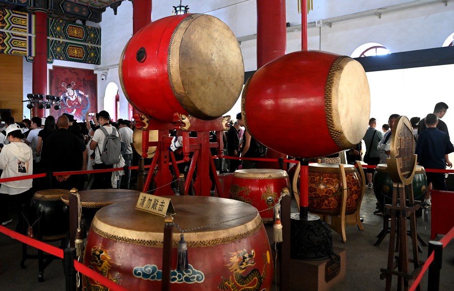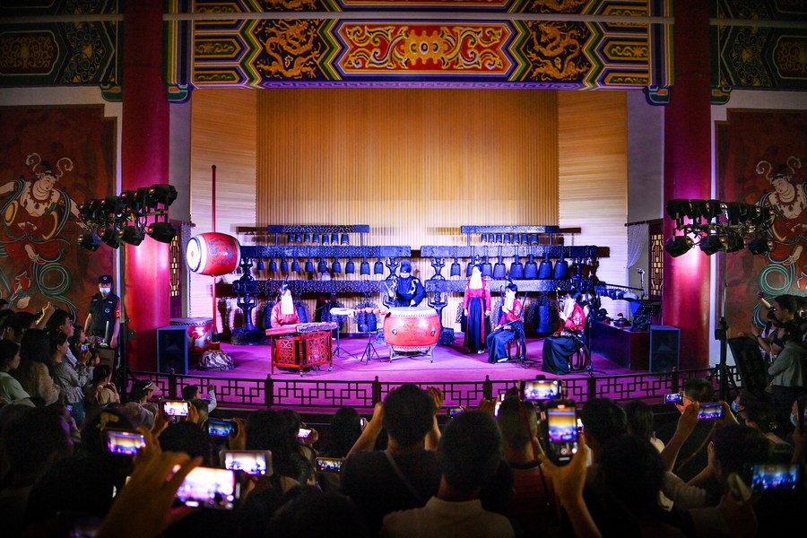 Tourists watch a performance at the Drum Tower in Xi'an, northwest China's Shaanxi Province, May 1, 2023. (Photo by Zou Jingyi/Xinhua)