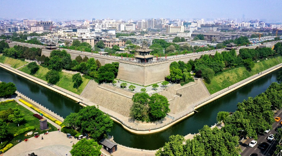 This aerial photo taken on April 15, 2023 shows a view of the southwest corner of the ancient city wall in Xi'an, northwest China's Shaanxi Province. (Xinhua/Liu Xiao)