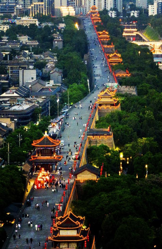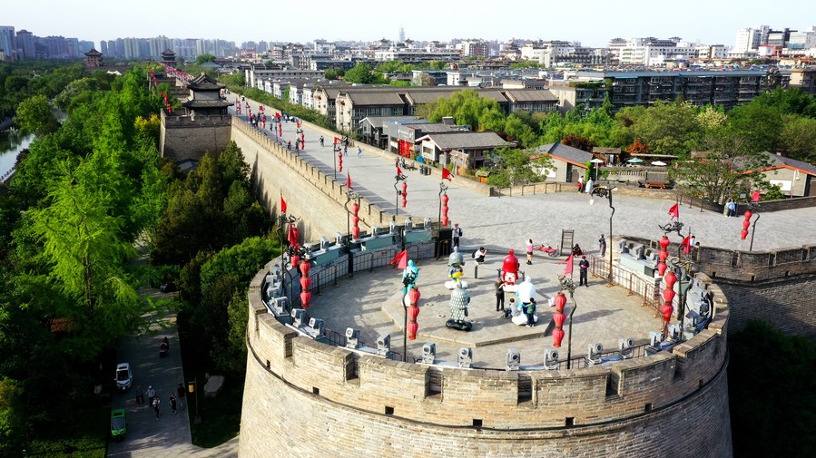 This aerial photo taken on April 30, 2023 shows tourists visiting the ancient city wall scenic spot in Xi'an, northwest China's Shaanxi Province. (Xinhua/Liu Xiao)