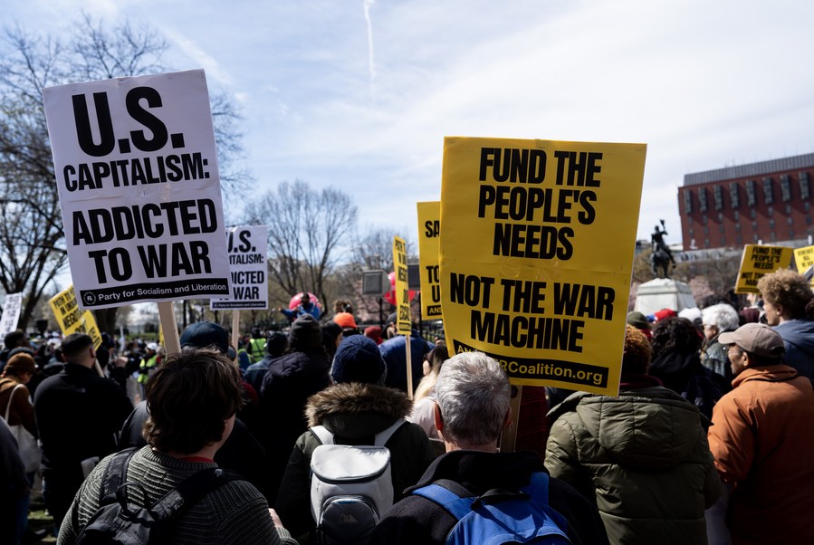 Protesters gather during the anti-war demonstration in Washington, D.C., the United States, March 18, 2023. Hundreds of protesters gathered outside the White House in Washington, D.C. on Saturday afternoon to demand a stop to endless U.S. wars and the "War Machine," two days before the 20th anniversary of the U.S.-led invasion of Iraq. (Xinhua/Liu Jie)
