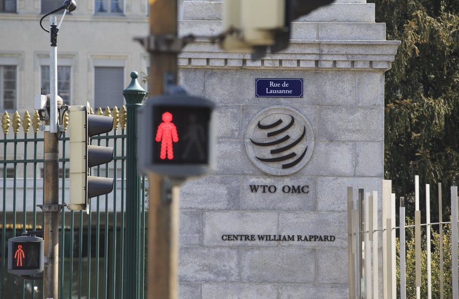 Photo taken on April 2, 2019 shows the WTO logo on the main gate of the World Trade Organization (WTO) in Geneva, Switzerland. (Xinhua/Xu Jinquan)
