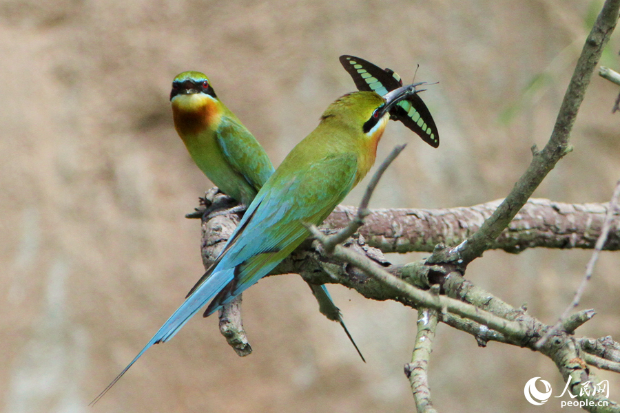 A blue-tailed bee-eater swallows a butterfly in a nature reserve in Xiamen, southeast China's Fujian Province. (People's Daily Online/Chen Bo)