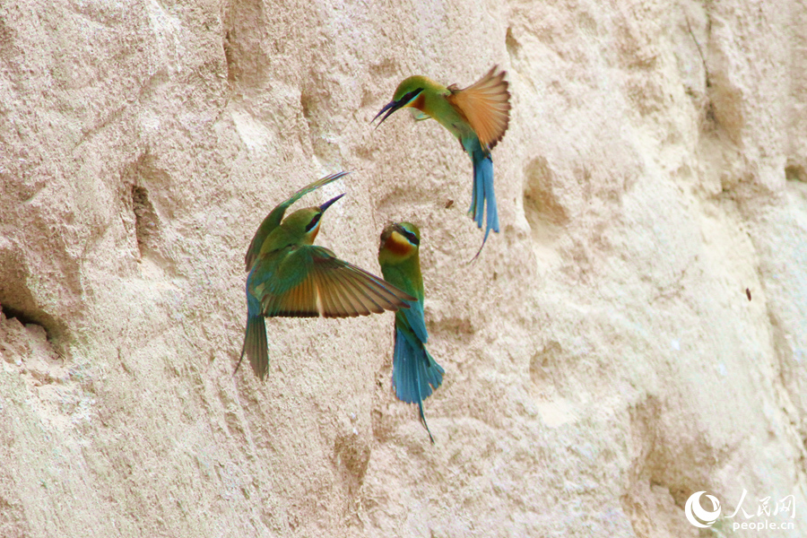 Blue-tailed bee-eaters play in a nature reserve in Xiamen, southeast China's Fujian Province. (People's Daily Online/Chen Bo)