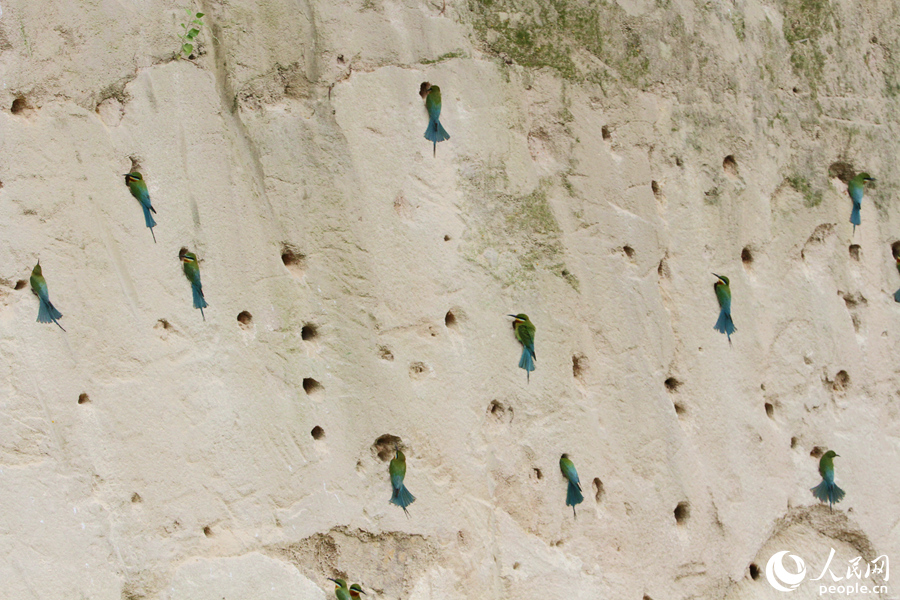 Photo shows the nests of blue-tailed bee-eaters in a nature reserve in Xiamen, southeast China's Fujian Province. (People's Daily Online/Chen Bo)