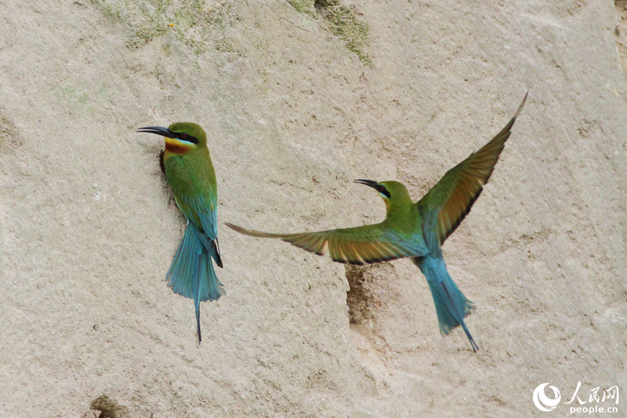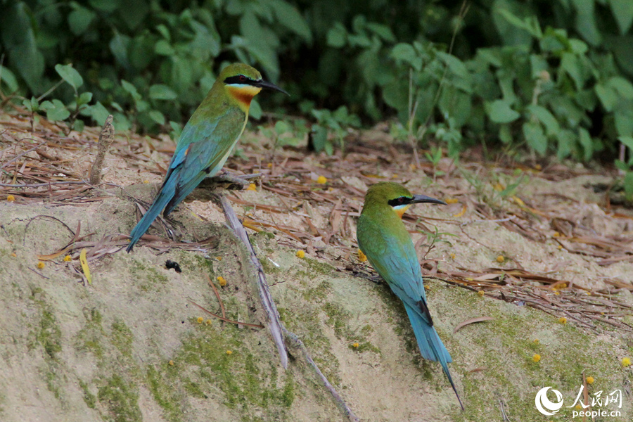 Two blue-tailed bee-eaters rest on top a cliff in a nature reserve in Xiamen, southeast China's Fujian Province. (People's Daily Online/Chen Bo)