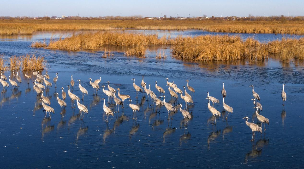 Photo shows common cranes in Hengshui Lake, Hengshui city, north China's Hebei Province. (Photo/Chen Kang)