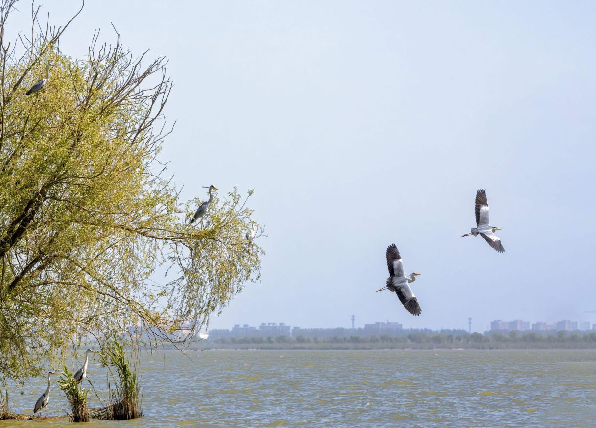 Grey herons fly over Hengshui Lake, Hengshui city, north China's Hebei Province. (Photo/People’s Daily Online)