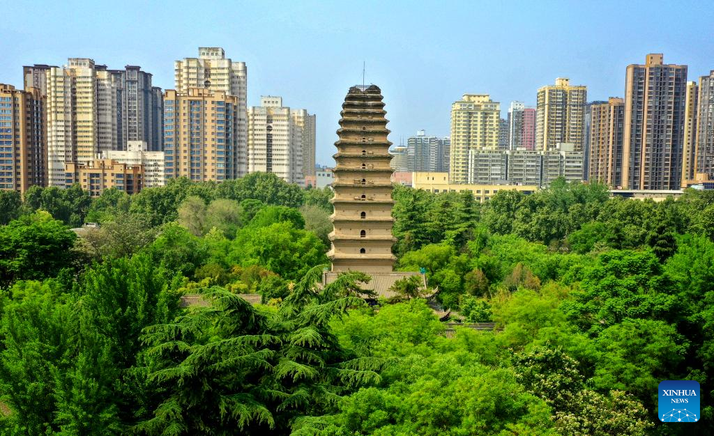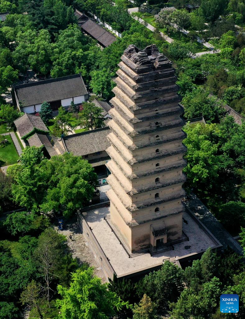This aerial photo taken on May 8, 2023 shows a view of the Small Wild Goose Pagoda in Xi'an, northwest China's Shaanxi Province. (Xinhua/Liu Xiao)