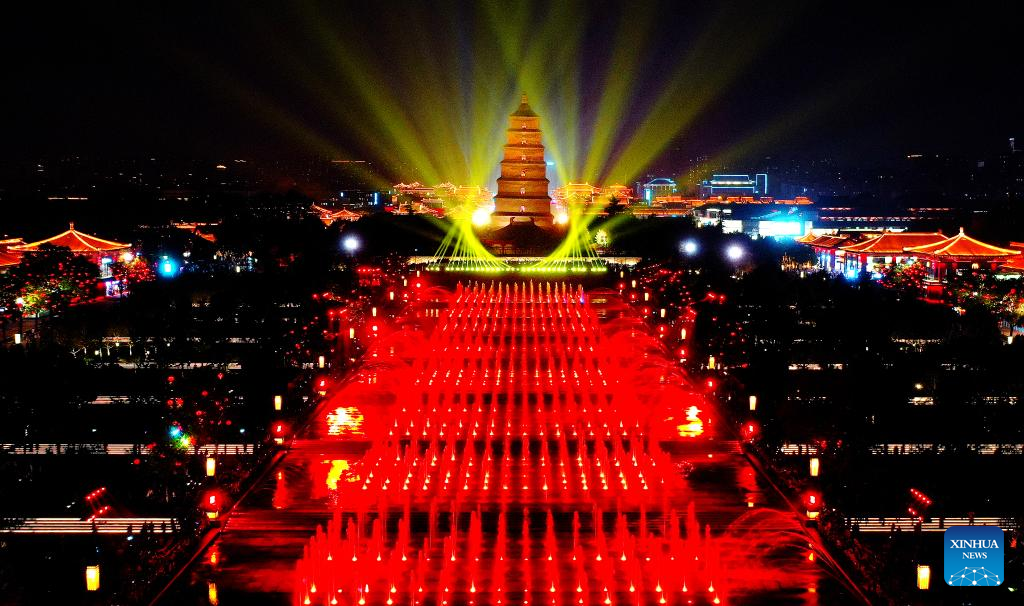 This aerial photo taken on April 18, 2023 shows a music fountain show at the north square of the Giant Wild Goose Pagoda in Xi'an, northwest China's Shaanxi Province. (Xinhua/Liu Xiao)