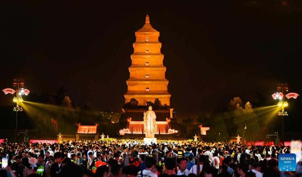 This aerial photo taken on April 18, 2023 shows the night view of the Giant Wild Goose Pagoda in Xi'an, northwest China's Shaanxi Province. (Xinhua/Liu Xiao)