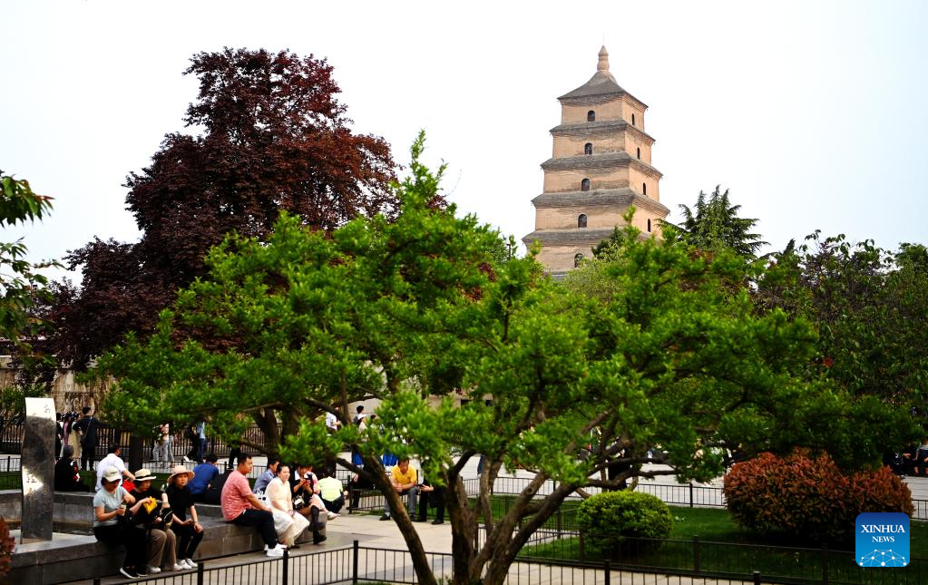 Tourists visit the Giant Wild Goose Pagoda in Xi'an, northwest China's Shaanxi Province, May 1, 2023. (Photo by Zou Jingyi/Xinhua)