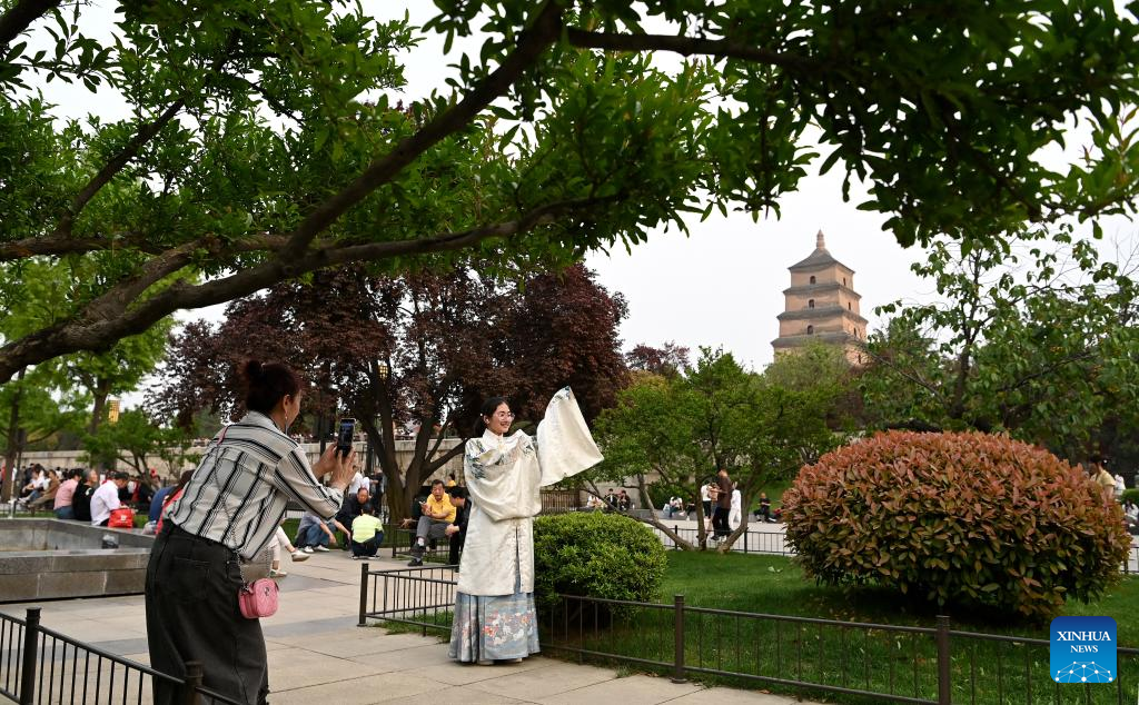 Tourists visit the Giant Wild Goose Pagoda in Xi'an, northwest China's Shaanxi Province, April 18, 2023. (Xinhua/Liu Xiao)