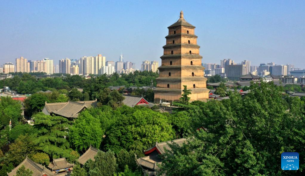This aerial photo taken on April 19, 2023 shows a view of the Giant Wild Goose Pagoda in Xi'an, northwest China's Shaanxi Province. (Xinhua/Liu Xiao)