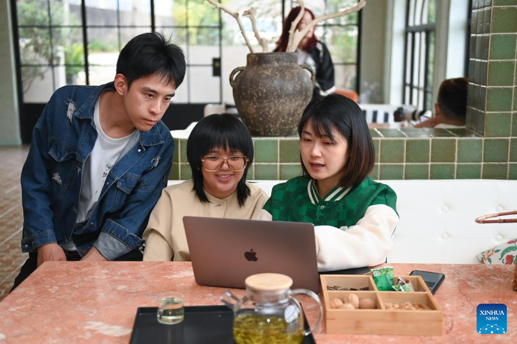 Yao Sunfang (1st R), owner of a homestay, talks with colleagues in Gaofeng Village of Deqing County, east China's Zhejiang Province, May 8, 2023. Deqing has been adhering to green development in recent years, making use of traditional cultural resources and developing leisure projects. (Xinhua/Huang Zongzhi)