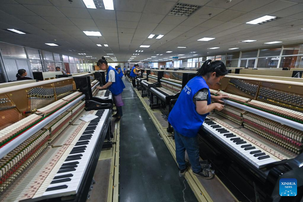 Workers assemble pianos on the production line of a piano factory in Luoshe Town of Deqing County, east China's Zhejiang Province, May 8, 2023. Deqing has been adhering to green development in recent years, making use of traditional cultural resources and developing leisure projects. (Xinhua/Xu Yu)