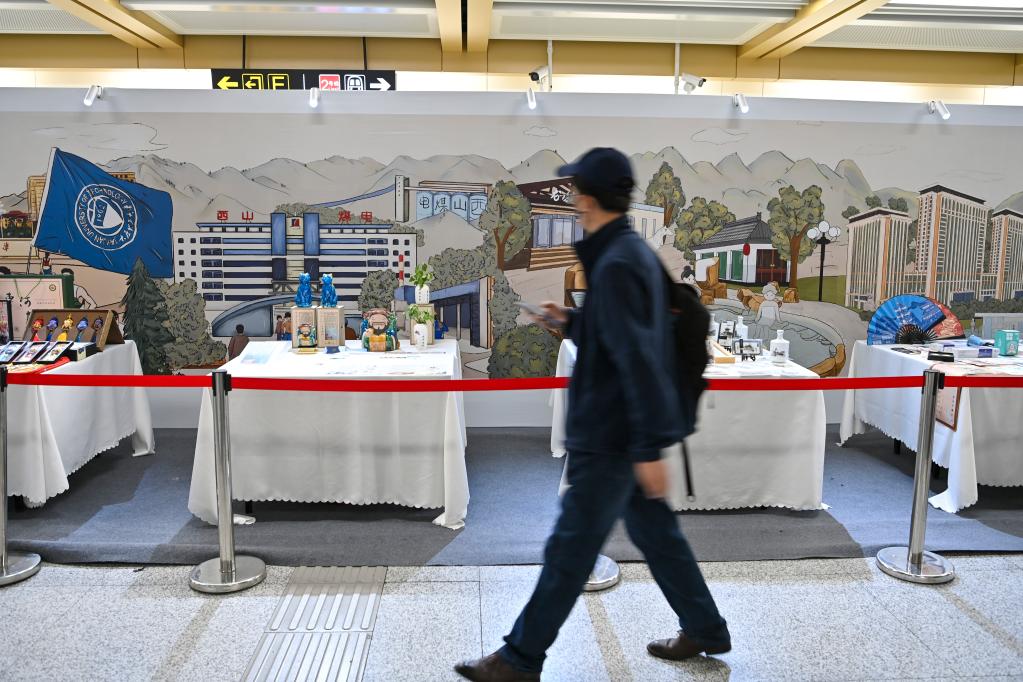 A man walks past several pieces of artwork at an exhibition featuring cultural and creative products at Dananmen Station of Taiyuan Subway Line 2, Taiyuan, capital of north China's Shanxi Province, May 9, 2023. More than 200 pieces of artwork were displayed at the exhibition, showcasing this city's history. The exhibition runs until May 12. (Xinhua/Yang Chenguang)