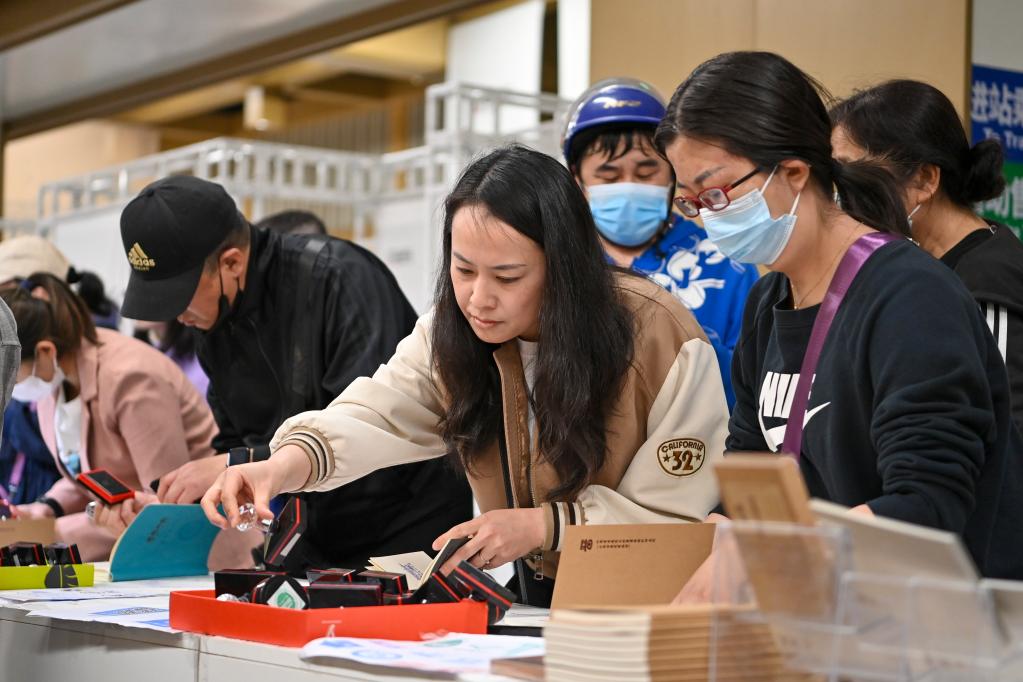 People join in a stamp collecting activity at an exhibition featuring cultural and creative products at Dananmen Station of Taiyuan Subway Line 2, Taiyuan, capital of north China's Shanxi Province, May 9, 2023. More than 200 pieces of artwork were displayed at the exhibition, showcasing this city's history. The exhibition runs until May 12. (Xinhua/Yang Chenguang)