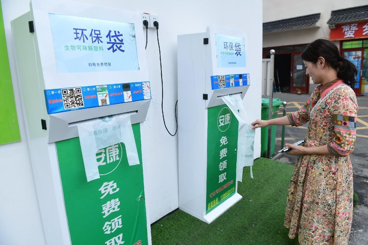 A woman gets free biodegradable bags from a self-service machine beside a farmers' market in Fuyang, east China's Anhui province. (People's Daily Online/Wang Biao)