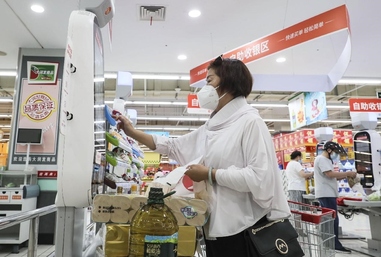 A woman pays on a self-checkout in a supermarket in Huai'an, east China's Jiangsu province. (People's Daily Online/Zhao Qirui)