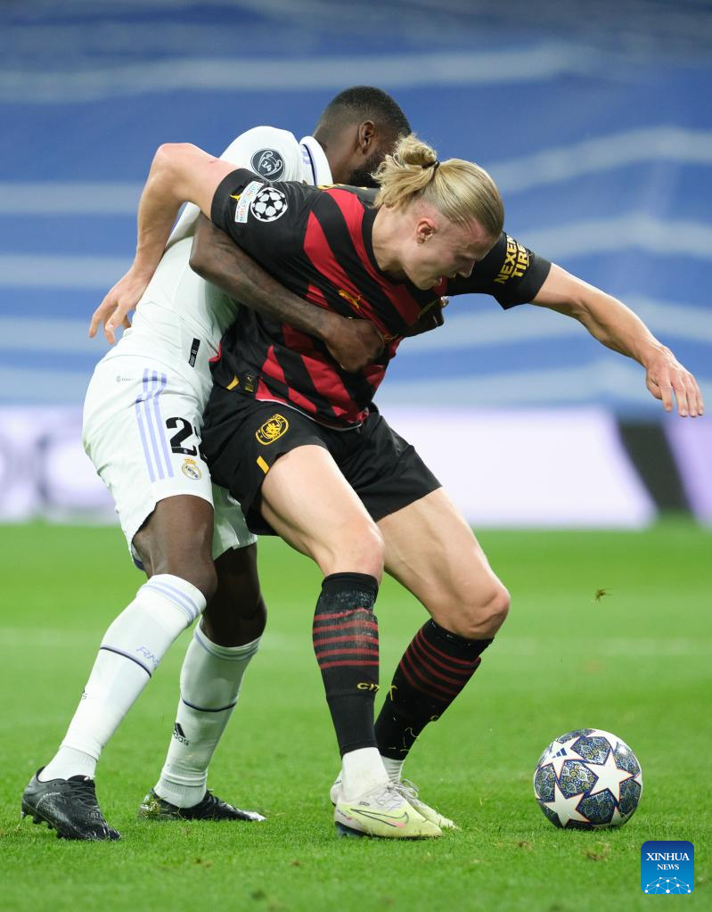 Antonio Rudiger (L) of Real Madrid vies with Erling Haaland of Manchester City during the UEFA Champions League semifinal first Leg match in Madrid, Spain, on May 9, 2023. (Xinhua/Meng Dingbo)