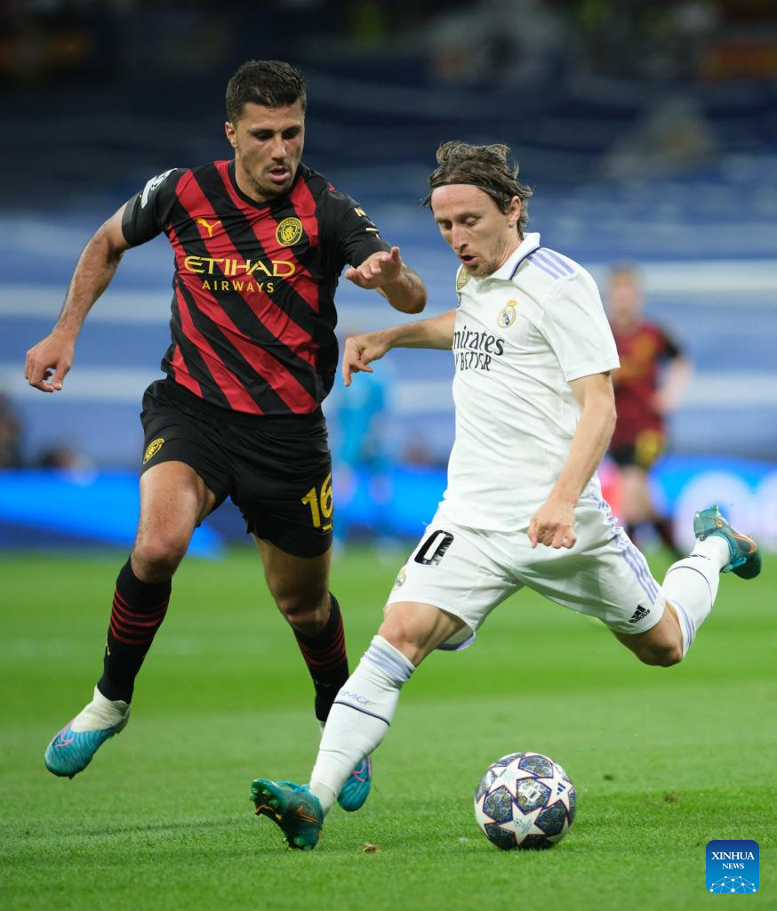 Luka Modric (R) of Real Madrid vies with Rodri Hernandez of Manchester City during the UEFA Champions League semifinal first Leg match in Madrid, Spain, on May 9, 2023. (Xinhua/Meng Dingbo)
