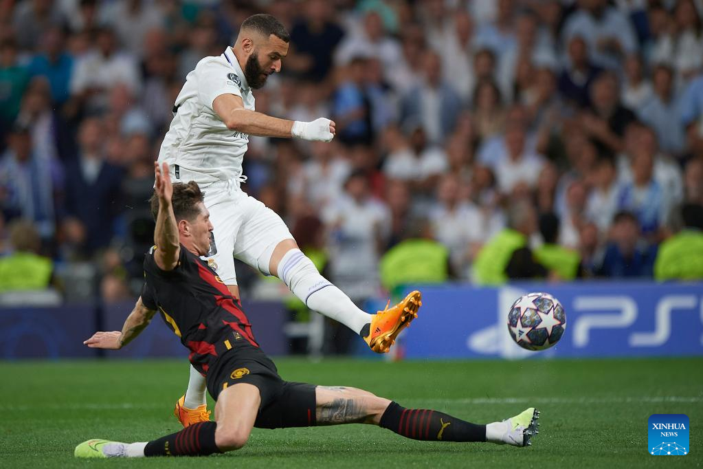 John Stones (below) of Manchester City defends Karim Benzema of Real Madrid during the UEFA Champions League semifinal first Leg in Madrid, Spain on May 9, 2023. (Photo by Pablo Morano/Xinhua)