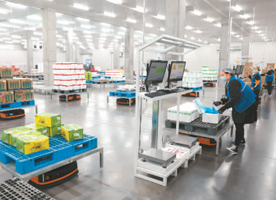 Robots convey products, including fresh vegetables and fruits, according to instructions at a logistics center in Xiangyang city, central China's Hubei Province, Feb. 27, 2023. (People's Daily/Yang Dong)