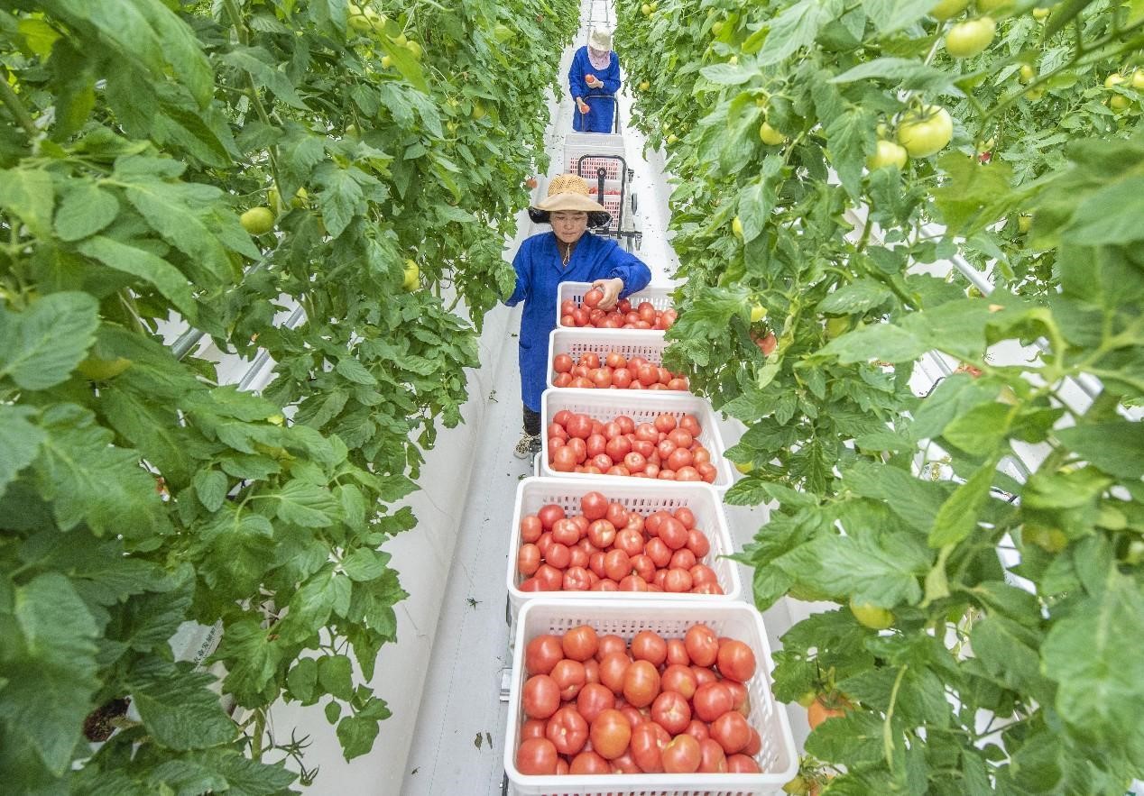 Tomatoes are picked in an agricultural technology demonstration park in Xinzhuang township, Suqian, east China's Jiangsu province. (People's Daily Online/Xu Jianghai)