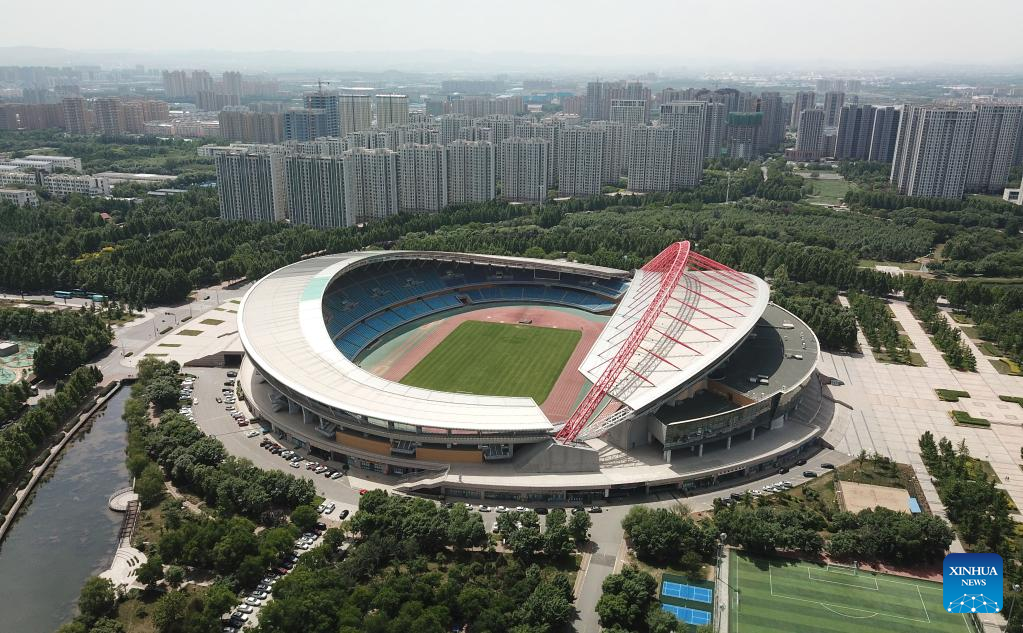 This aerial photo taken on May 8, 2023 shows a view of the stadium of the Zibo Sports Center in Zhangdian District of Zibo, east China's Shandong Province. (Xinhua/Xu Suhui)