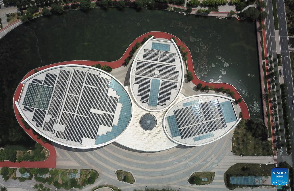 This aerial photo taken on May 8, 2023 shows a view of the Zibo Convention and Exhibition Center in Zhangdian District of Zibo, east China's Shandong Province. (Xinhua/Xu Suhui)