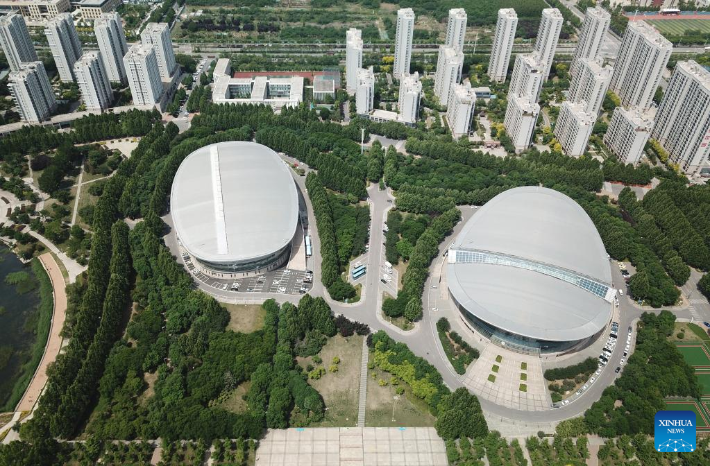 This aerial photo taken on May 8, 2023 shows a view of the gymnasium (R) and indoor swimming pool of the Zibo Sports Center in Zhangdian District of Zibo, east China's Shandong Province. (Xinhua/Xu Suhui)